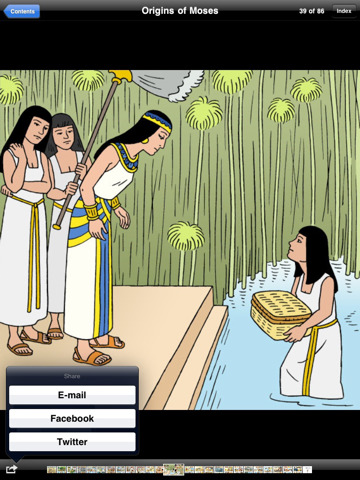 Bible Comic that will give you a different section of the Bible each week (for $US2.99). In the second purchase format there are three sections in each of the old and New Testaments - 'The Genesis', 'The Exodus', 'Kings and Prophets' for the OT and 'Birth of Jesus', 'Parables and Miracles', 'Passion of Jesus Christ'. You can also purchase individual Bible stories. In the free format you will be will 'pushed' varied products each time you open it. I found this frustrating and would recommend simply purchasing the Old and New Testaments if you want this app. Having said this, I'm not sure I'd buy the apps for the purposes of my children's biblical education. The comic book format will be appealing for children but the apps offer no more than this. There are no additional interactive features or even sound. The comics use simple language that most 6-12 year olds will be able to read and like any comics they have frames that have no words.